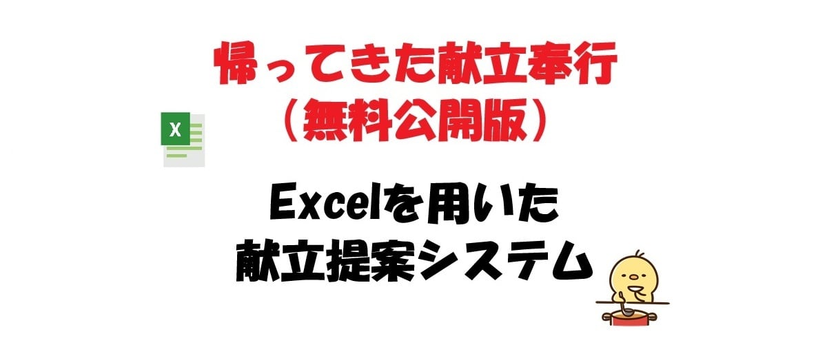 献立でお困りの方へ朗報! 本サービスでは、 ⓵簡単操作で献立を提案するシステム(Excel) ②在庫食材や特売食材、節約食材だけでだけで作れる料理を検索するシステム(Excel) ③動画をストップすれば献立が決まる献立提案ルーレット(MP4) の3コンテンツを提供します。 ※登録料理数:2200品(コンテンツ② コンテンツ⓵ではシステムに組み込めない料理は省略) これらのコンテンツでは次のような方を対象にしています。 ・家庭料理程度の知識、スキルのある方 ・Excelのフィルター検索ができる方 ・Excelが使えるパソコンをお持ちの方 ※料理自体はできるが献立に困っている方が対象です。 コンテンツ詳細 コンテンツ⓵ 帰ってきた献立奉行 パソコンのF9キーを押すたびに献立が提案されます。 和洋中+その他のジャンルについて ・主食(基本の主食、炊き込みご飯など、主食兼主菜) ・主菜(肉、魚、その他) ・副菜(2種) ・汁物 ・その他(漬物など。洋食、その他では該当料理なし) ・果物(出回り時期に応じて提示。春、夏、秋、冬) 本コンテンツではご自身でメニューリストの編集、追加、削除ができます。 詳細はコンテンツにて。 コンテンツ② 献立奉行~アルモンデ版~ 在庫食材など特定の食材を使った料理を検索するとき「(食材名)+レシピ」のような検索をされるのではないでしょうか? しかし、その検索方法では在庫食材以外の食材も必要になる料理もヒットしてしまいます。 本コンテンツでは理論上在庫食材だけでできる料理の検索も可能です。 他にも特売食材を登録すれば特売食材を使った料理の検索も可能です。 また、節約食材も事前に登録されているため節約料理も検索できます。 嗜好やアレルギーの関係で食べられない食材がある場合にはその食材を使わない料理の検索も可能です。 料理の難易度、調理時間、和洋中の区分、主食、主菜などの区分、その料理のメイン食材、調理法で複合的に絞込検索ができます。 詳細は添付画像にて。 本コンテンツで検索した料理は料理名と上記の情報、食材名(一般的に在庫があると考えられる調味料類は表示されません)のみ確認できます。 分量は確認できません。 基本的に普段から料理をされている方であればこれらの情報から調理可能な内容としています。 詳細はコンテンツにて。 コンテンツ③ 特典動画 献立提案ルーレット コンテンツ⓵をもとに作成した献立(50食分)をスライドショー動画にし、好きなところでストップさせることで献立が提案されます。 コンテンツ⓵はパソコンがなければ使えませんが、本コンテンツは出先でもスマホがあれば使えます。 公共交通機関利用時などでも音による周りへの迷惑の心配がない無音仕様です。